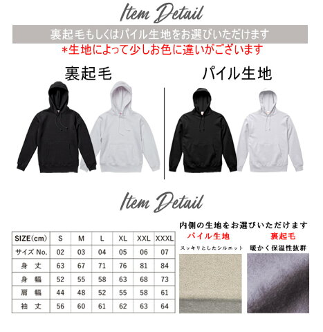 【商品内容】 デザインパーカー 【カラー】 ・ホワイト・ブラック 【商品詳細】 【サイズ展開】・S/M/L/LL【ボディ生産国】中国【印刷】日本 【注意事項】・各採寸箇所については、実寸(平置き)より約-2cm〜+2cm程度は誤差の許容範囲とさせて頂いております。
