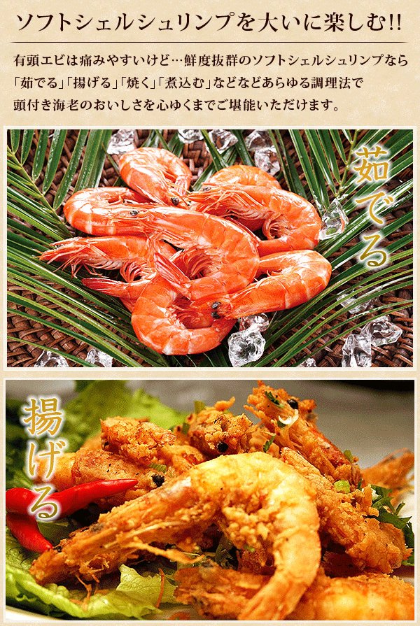 居酒屋 レストラン カフェ 中華料理店 焼肉店 食堂 お弁当屋さん 和食料理店 洋食料理店 パン屋さん カラオケ店 ホテル 旅館 喫茶店脱皮したての殻が柔らかい海老=ソフトシェルシュリンプはそのまま加熱調理で殻ごと、頭ごと頂けてしまうタイプ! ですので海老本来の風味と旨味が抜群で、殻に含まれるカルシウムやキチンキトサンなども摂取できる栄養も豊富なおいしさです♪